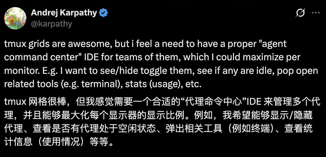 在卡帕西眼里,tmux网格(把终端窗口切成整齐的小格子,同时跑多个命令)勉强凑合,但缺了一些掌控全局的爽感,新一代IDE得有这些技能: