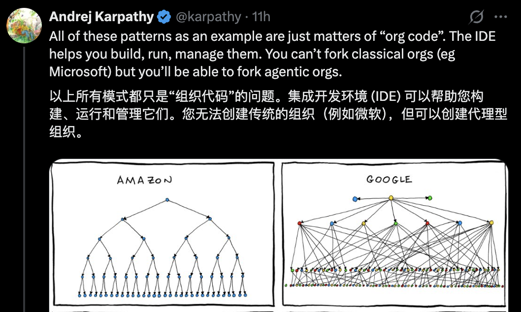 他配文说,这些都是组织代码(org code),未来的IDE就是用来构建、运行、管理这些东西的。