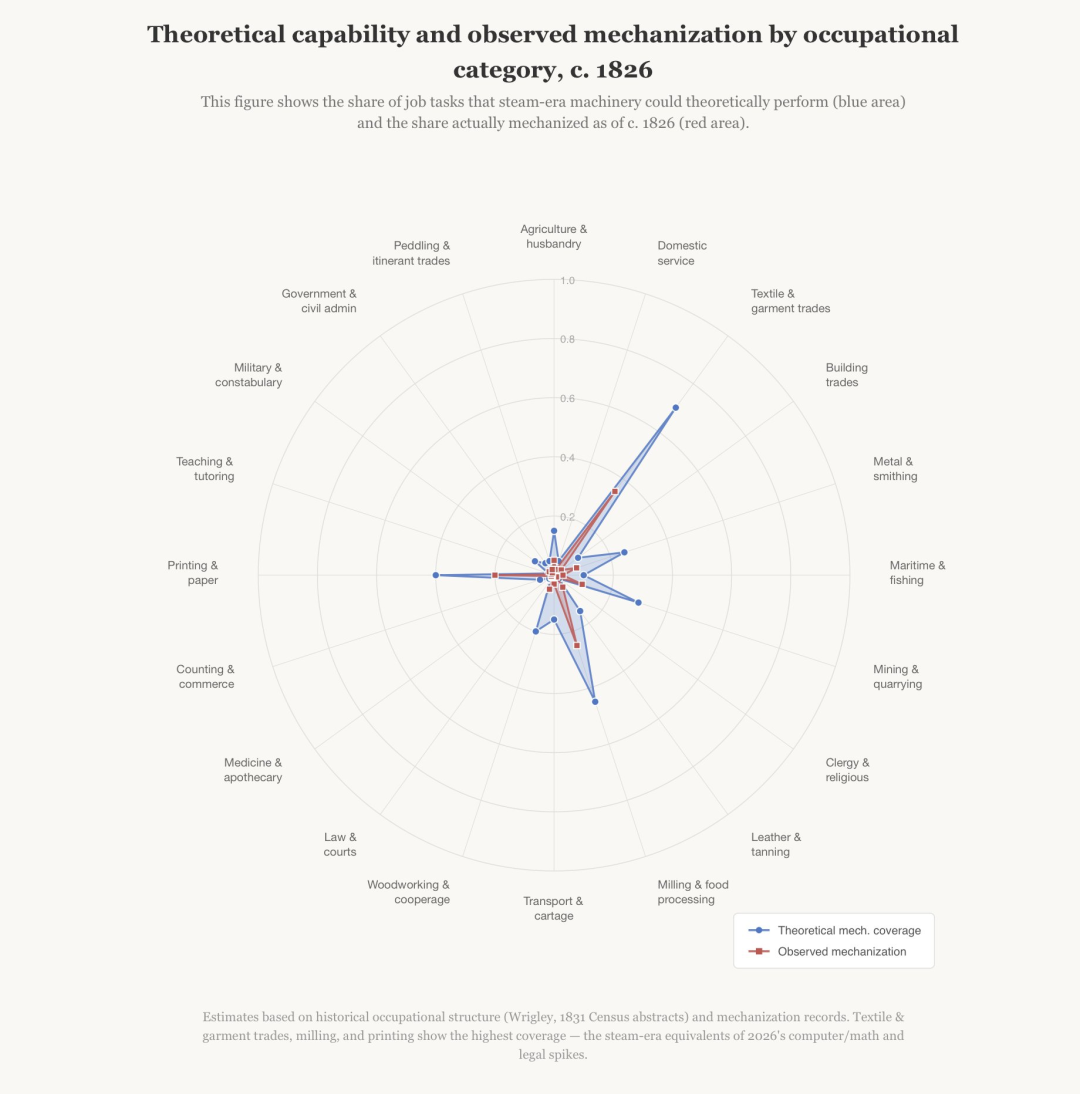 Anthropic发布了一份劳动力市场报告,一位经济学家制作了一张模拟 1826 年人工智能自动化就业情况的图表