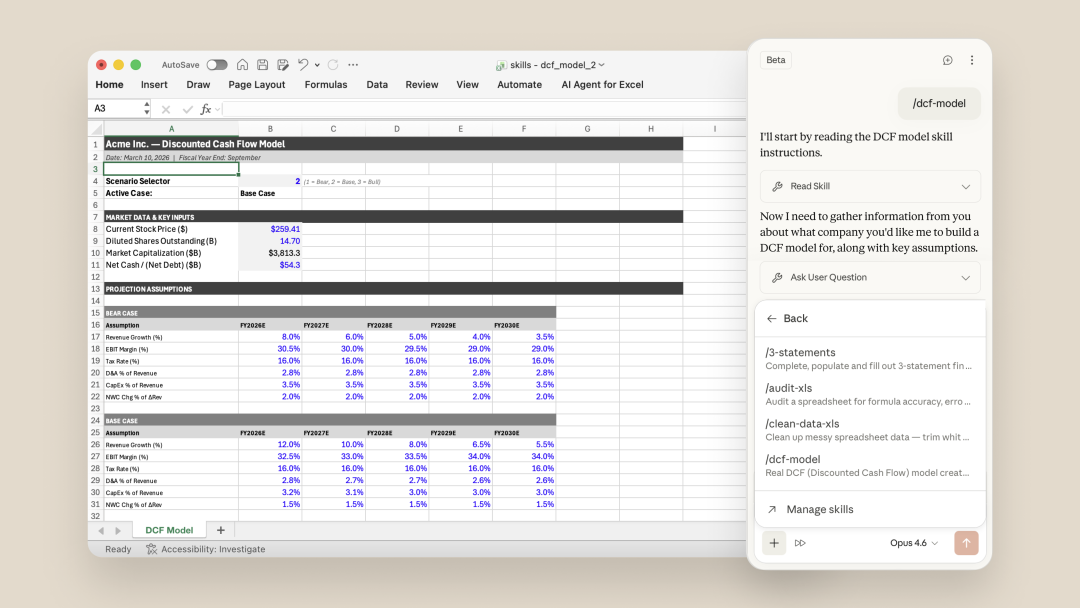 Claude这次更新还预置了包括财务模型审计、DCF模板构建、PPT逻辑润色等专业技能。