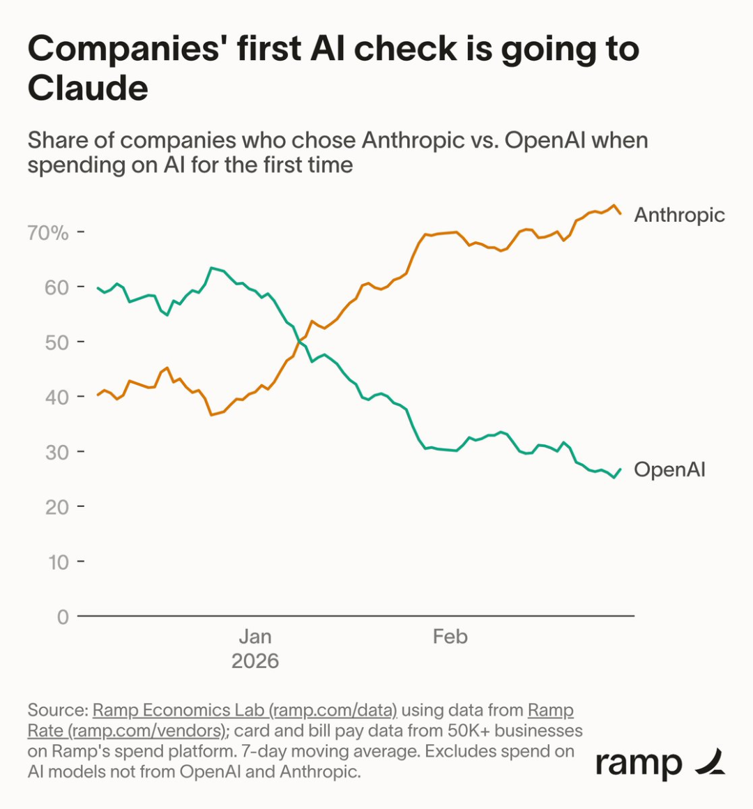 据最新Ramp AI指数显示,Anthropic已超越OpenAI,成为美国企业的首选。