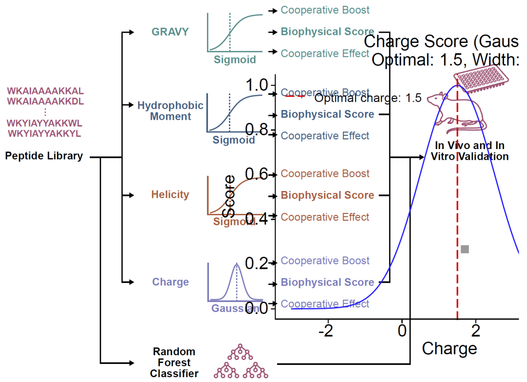 抗菌肽是一类具有潜力的候选分子,它们通常通过破坏细菌膜而发挥作用,因此不依赖细菌代谢状态,对持留细胞和生物膜同样有效。然而,传统的抗菌肽设计主要依赖经验性调控电荷、疏水性和螺旋结构等参数,难以在庞大的序列空间中高效筛选。近年来,机器学习被用于抗菌肽预测,但多数方法只依赖统计相关性,缺乏对膜作用机制的约束,导致筛选结果在生物学上不一定可行。