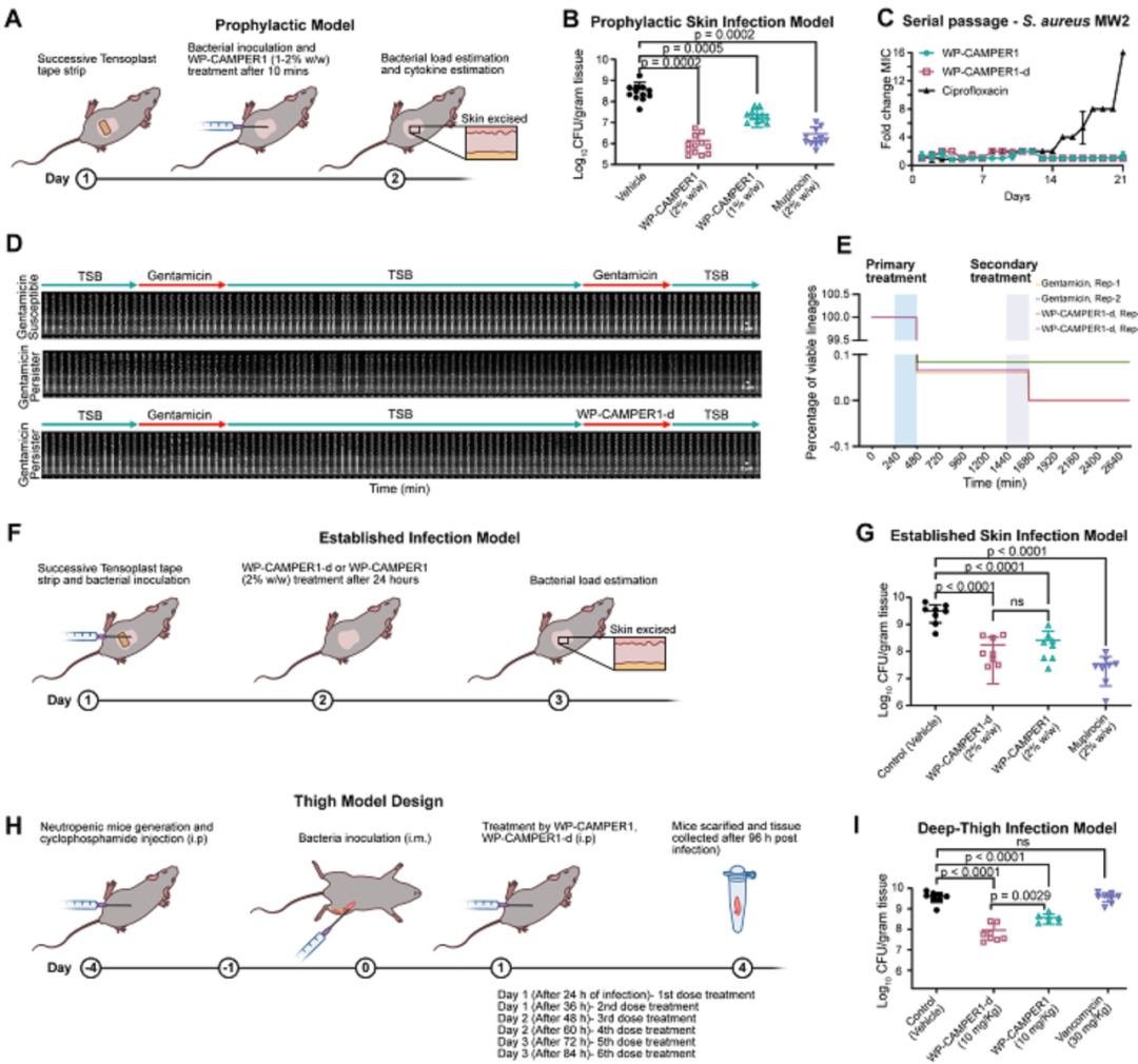 在小鼠皮肤感染模型中,WP-CAMPER1显著降低细菌负荷,而D-构型变体具有更好的稳定性和持续杀菌能力。在单细胞微流控实验中,该肽能够清除极少数存活的持留细胞。在深部感染模型中,D-构型肽显著减少持留菌数量,而常规抗生素效果有限,说明该策略具有潜在临床应用价值。