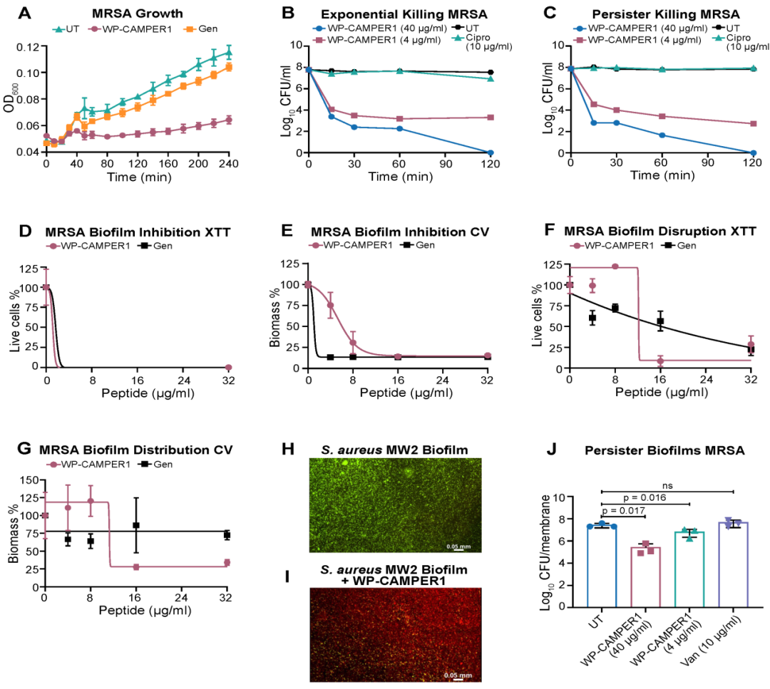 实验结果显示,WP-CAMPER1不仅能杀死指数生长期细菌,还能快速清除静止期持留细胞,并对耐药菌株同样有效。在生物膜模型中,该肽能够抑制生物膜形成并破坏成熟生物膜,显著降低细菌数量,表现出优于常规抗生素的活性,证明膜破坏机制能够有效对抗耐药和休眠状态细菌。