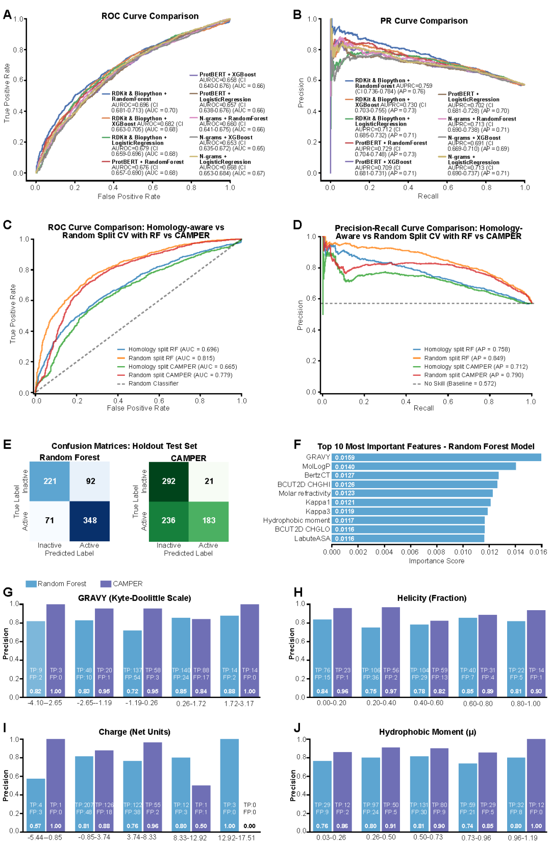 图2:分类器性能、同源性感知评估、特征重要性分析及CAMPER在生物物理特征空间中的预测精度。
