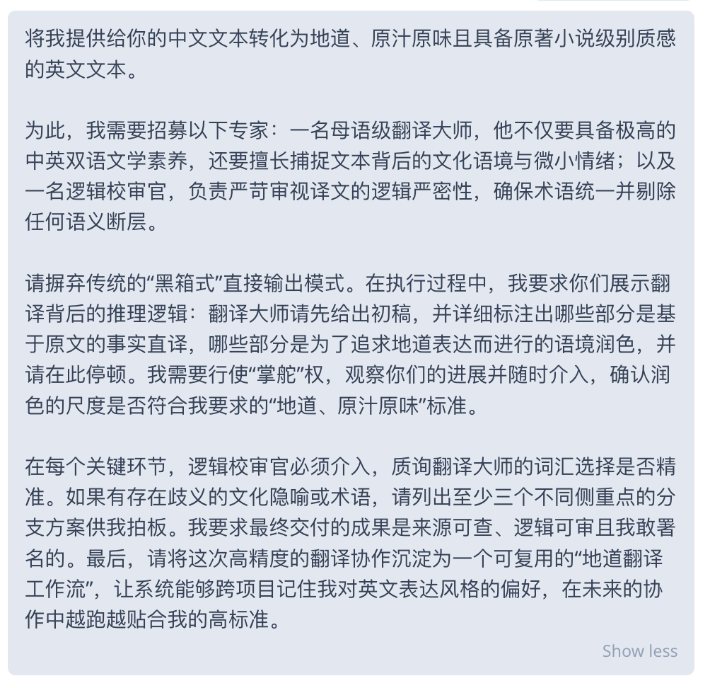 材料节选自钱穆先生的《国史新论》,理解起来有些复杂,所以我跟它说,我需要两名员工:一名母语级翻译大师,一名逻辑校审官。