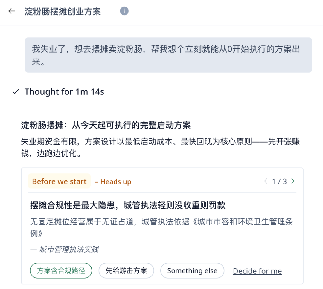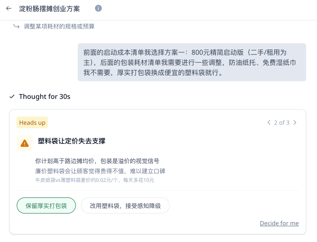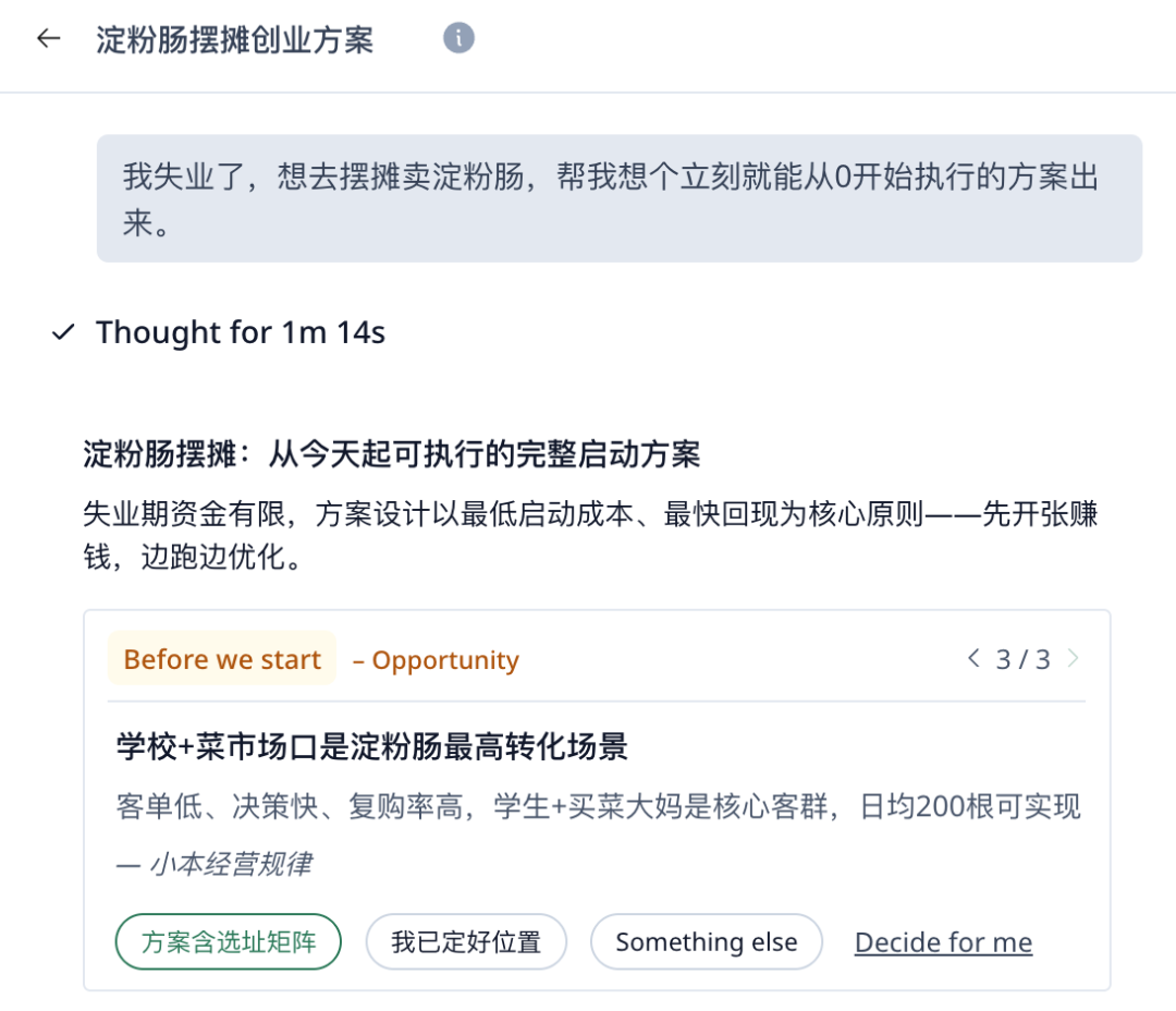 在哪里摆摊卖呢?我一头雾水,所以希望它给我的方案包括选址的决策逻辑。但如果你很有主见,预先就想好了摆摊地点,就可以明确告诉它大方向。