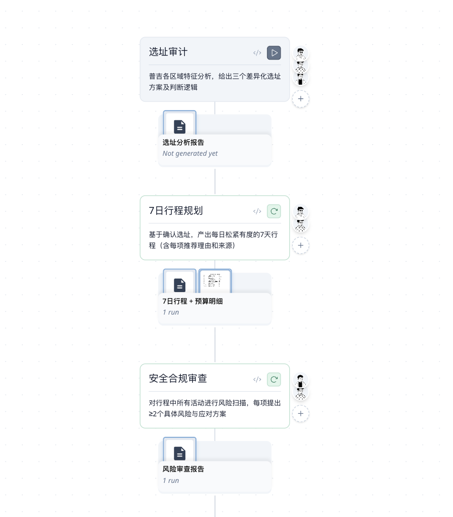 任务会被拆解成具有先后关系的节点:谁负责搜索、谁负责整理、谁负责校对,以及在哪些关键节点需要回到用户进行确认。
