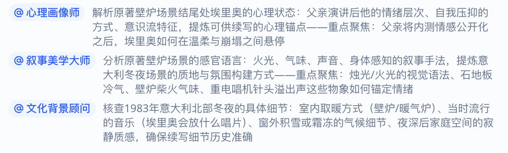 紧接着系统自动将这个任务拆解成这么几步,包括风格研究、续写创作、润色校准,曾经在其他任务里调教过的AI专家们,又齐聚一堂了:
