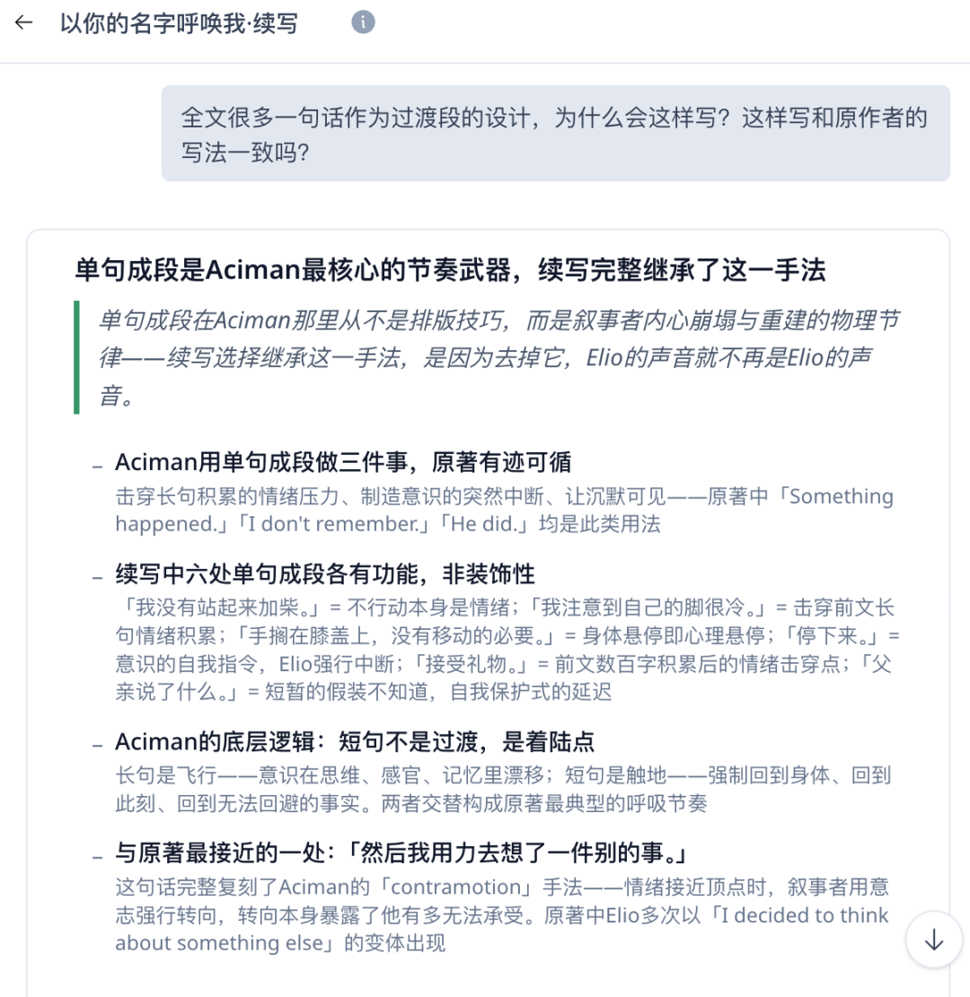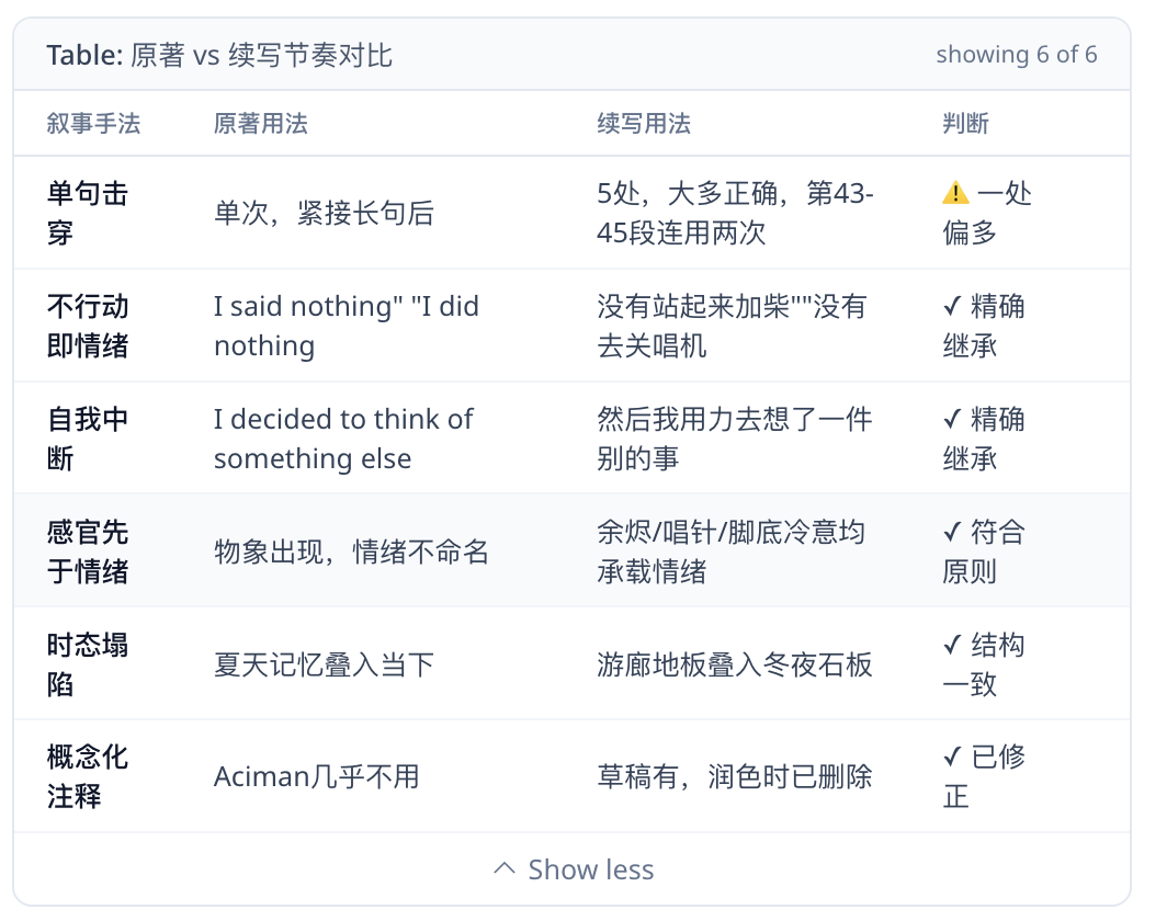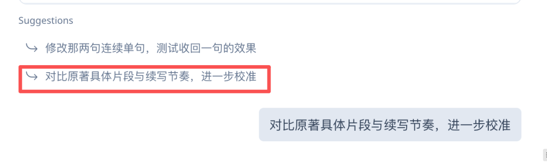 紧接着,上面翻译用到过的“校审官”不请自来,它对自身要求很高,直接给我摊开展示哪些地方续写得与原著吻合,哪些地方还要再进行校准: