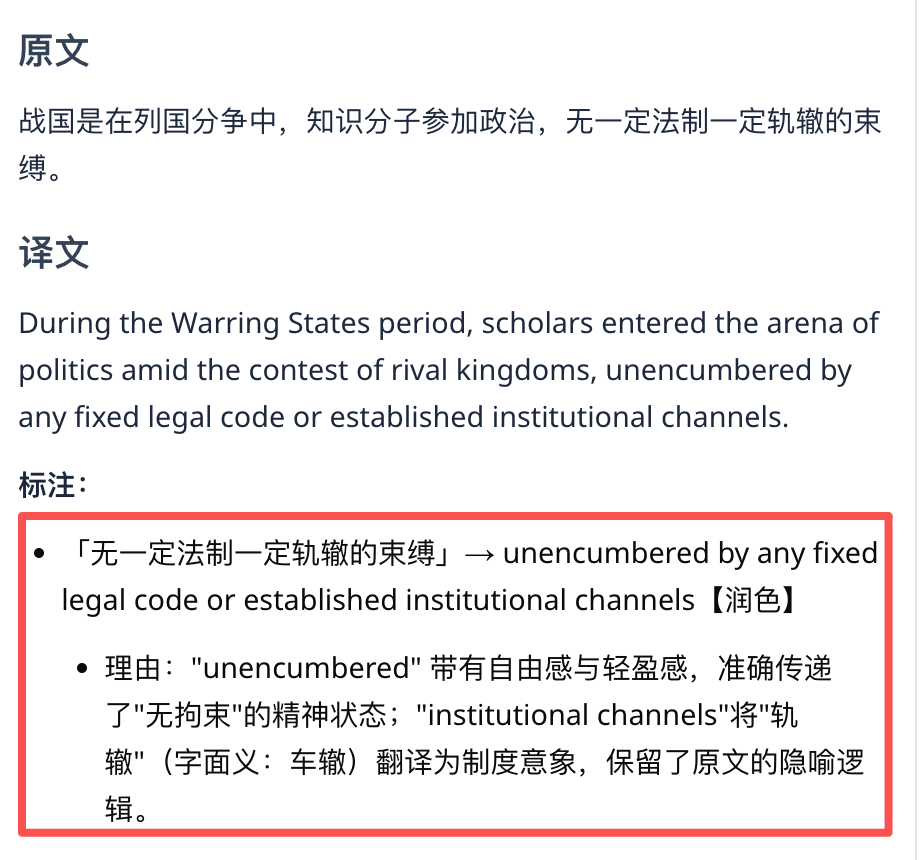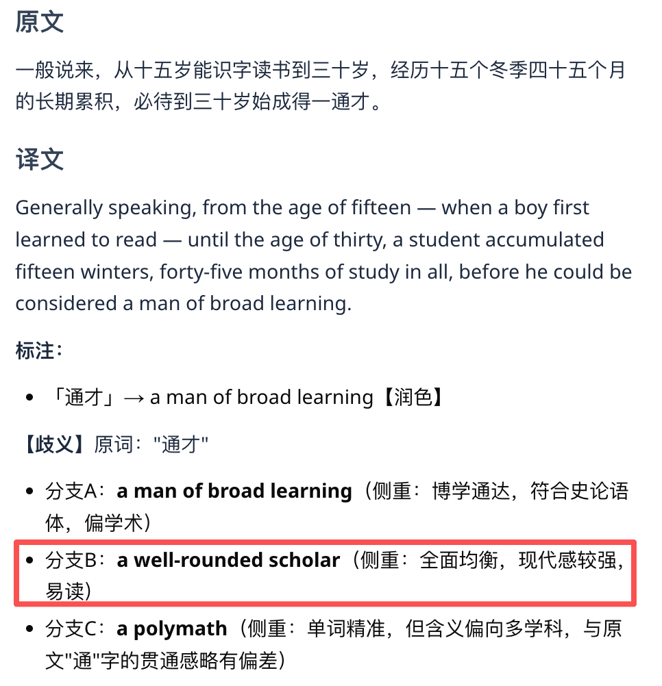 翻译得够不够信达雅咱先不说,至少看上去它是诚实的——逐段进行拆分,会把它为何选择这么翻译的思路,清晰展示出来: