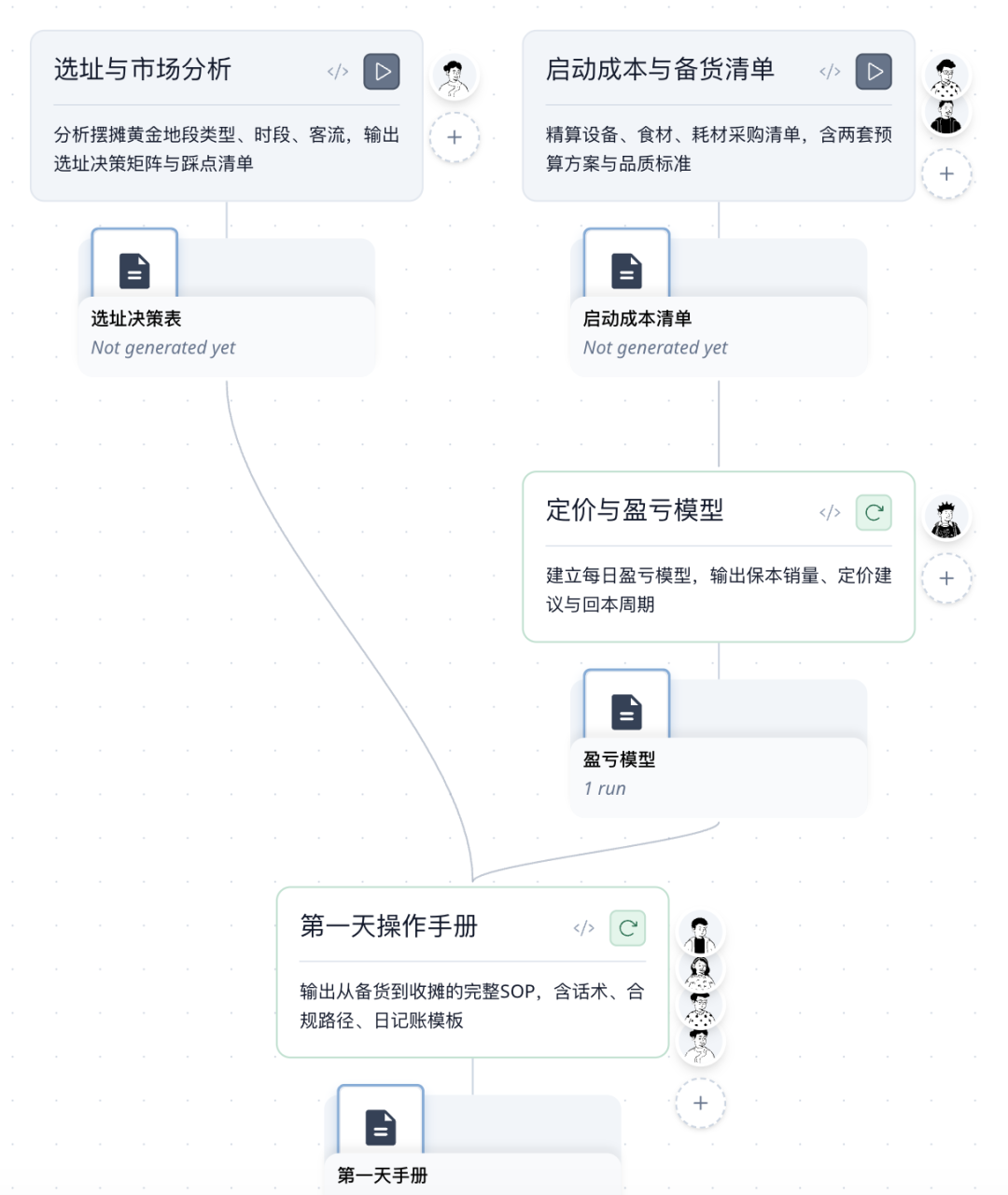 几个员工这么一顿忙活下来,再加上我的及时纠偏和确认,直接整出来一个包含选址决策、启动成本清单、定价与盈亏模型、第一天SOP的完整创业手册。