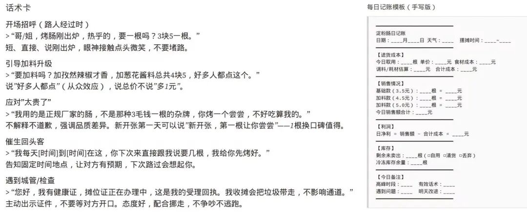 甚至连跟路人打招呼揽客的话术、食品安全注意事项、每日记账模板都给我备好了,I人P人看了真是狂喜啊!!!