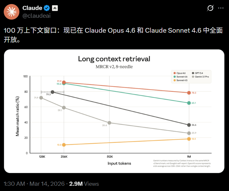 Claude Opus 4.6和Sonnet 4.6的百万token上下文窗口,正式全面上线。