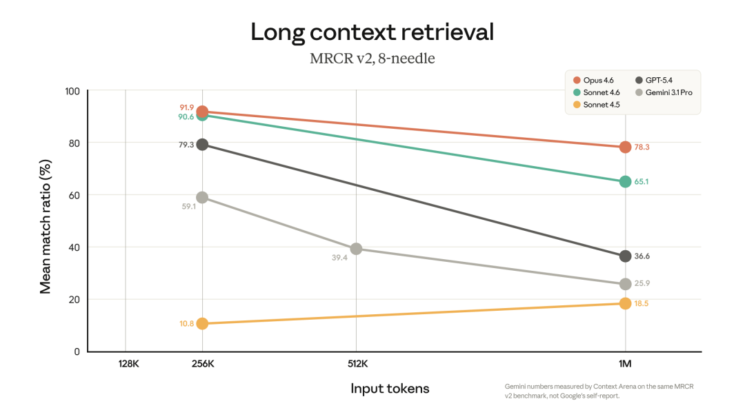 在专门考验超长文本「大海捞针」能力的MRCR v2测试中,Opus 4.6拿到了78.3%的高分,同等上下文长度的前沿大模型中排名第一。