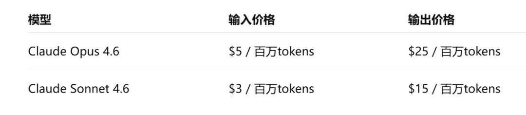 Opus 4.6每百万token输入5美元、输出25美元,Sonnet 4.6输入3美元、输出15美元,全窗口一口价。