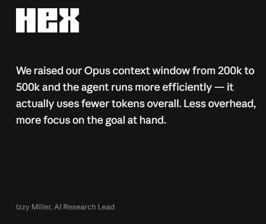最反直觉的发现来自数据分析平台Hex,他们把Opus的上下文窗口从20万提升到50万之后,智能体不仅没有消耗更多token,反而整体用量更少了。