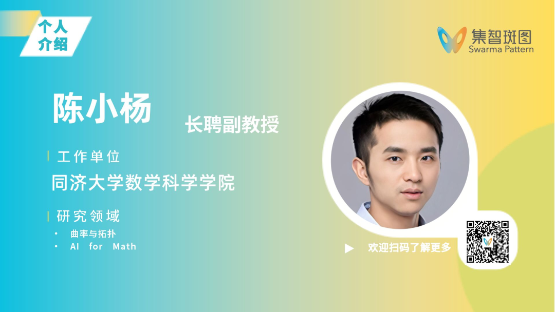 陈小杨,同济大学数学科学学院长聘副教授,国家级青年人才获得者。主要研究方向:曲率与拓扑。曾主持国自然基金青年,面上各一项。在Geometry & Topology, Advances in Mathematics, Mathematische Annalen , Mathematische Zeitschrift 等知名期刊发表多篇学术论文,并获得2019 年世界华人数学家联盟最佳论文奖(若琳奖)。陈小杨老师还发起了人工智能与数学读书会,训练了面向大学生与研究人员的数学大模型,促进了人工智能与数学的交叉融合。