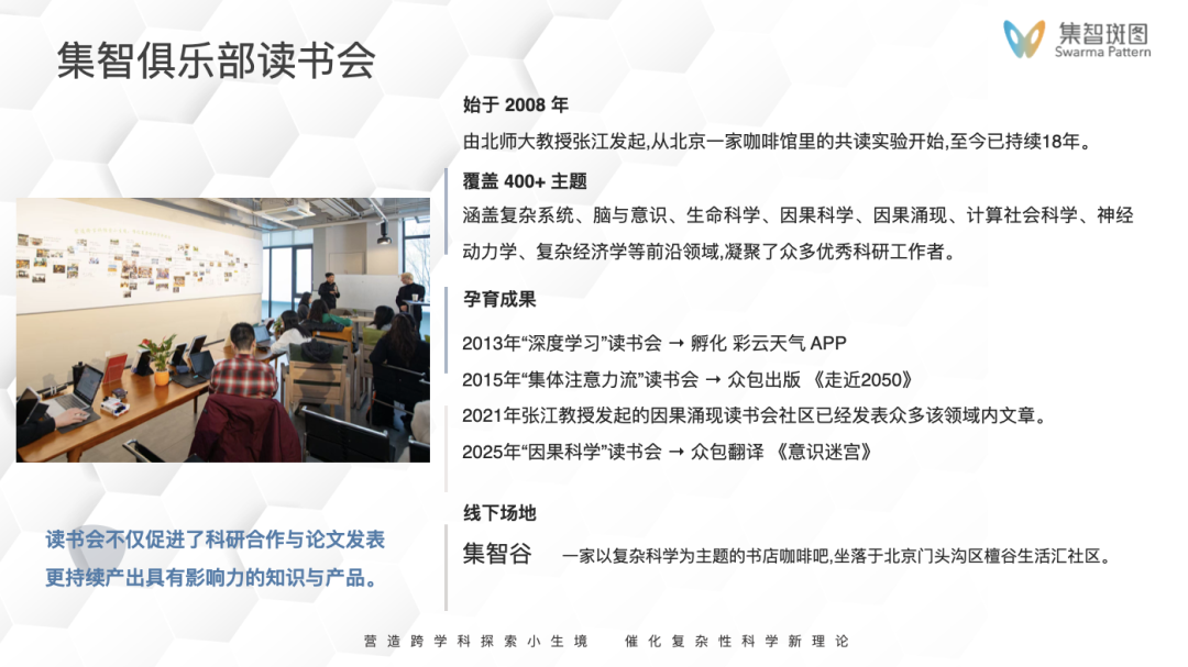 集智读书会是集智科学研究中心发起的最核心、最活跃的学术交流形式。它并非传统意义上的“读书”,而是一个高强度的线上研讨会 (Intensive Online Seminar)。自2008年正式以读书会形式组织活动以来,我们已经成功举办了四百期主题式读书会,主题涵盖从人工智能、复杂系统、统计物理、因果科学、生命复杂性到大模型的理论基础。