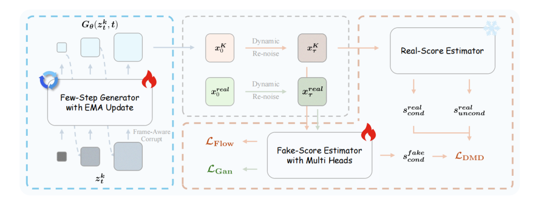 图|对抗性分层蒸馏流程。该框架基于 DMD,并进行了改进,包括纯教师强制、分阶段反向模拟、粗到细学习以及对抗性后训练等。
