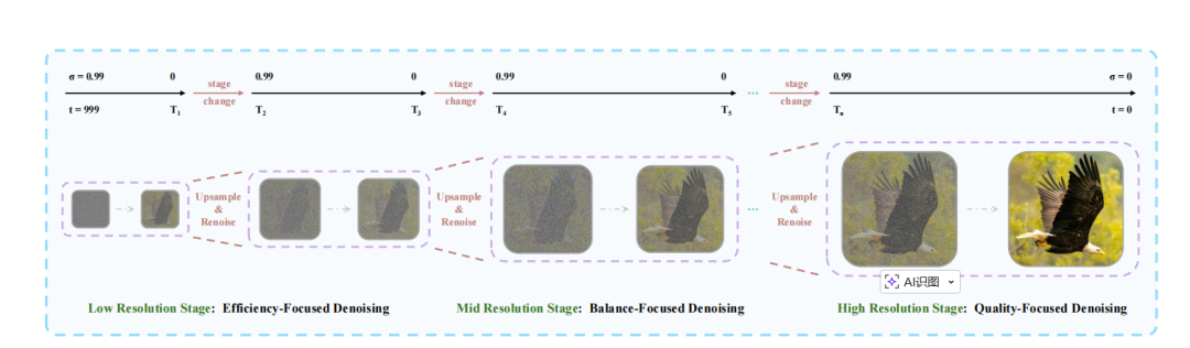 图|金字塔统一预测校正器的概述。该过程分为三个阶段:(i) 低阶段注重效率,(ii) 中阶段平衡质量和效率,(iii) 高阶段优先考虑质量。