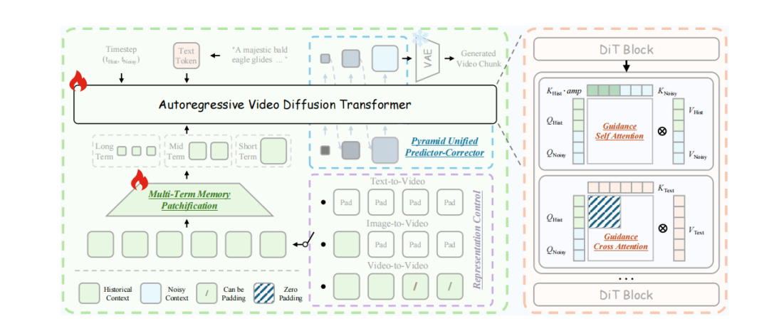 图|Helios 整体架构。它是一个基于引导注意力块的自回归视频扩散 Transformer。通过多阶段记忆分块化和金字塔统一预测校正器,大幅压缩历史与噪声上下文,并通过表示控制统一了 T2V、I2V、V2V 任务。