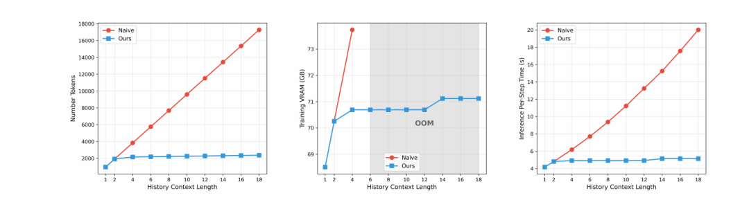 对历史上下文采取分层压缩,距当前帧越近的历史,保留越精细的细节;越久远的帧,压缩率越高。这一设计符合也削减了历史帧侧的 token 总量。