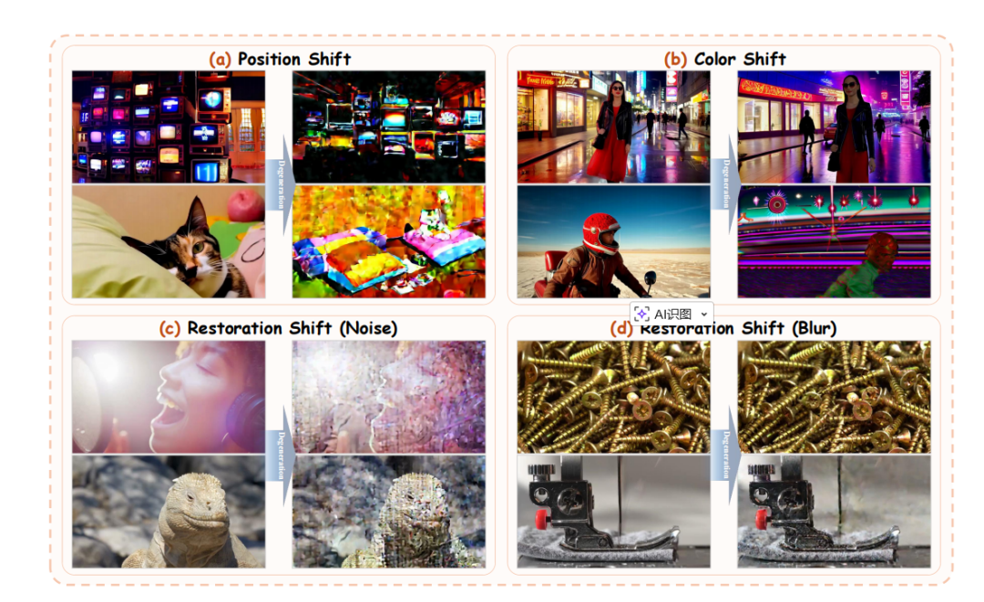 图|长视频生成中三种代表性的漂移模式:位置偏移、颜色偏移、修复偏移。