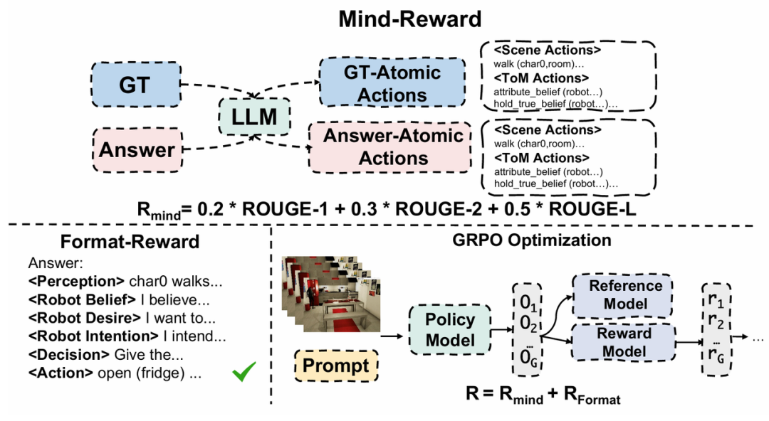 为了让模型不仅能够「按要求输出」分层推理结果,还能够真正生成与证据一致、与决策和动作一致的ToM推理过程,研究人员采用了一个两阶段优化思路:先通过SFT(Supervised Fine-Tuning) 建立模型的基础分层推理能力,再通过GRPO(Group Relative Policy Optimization)进行强化优化,其中重点设计了面向ToM推理的奖励函数Mind-Reward。