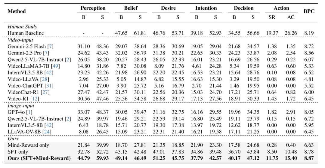 在完成MindPower Benchmark的数据、任务与评估设计后,研究人员在该基准上对人类参与者、闭源VLM以及开源VLM进行了系统评测。实验采用训练集/测试集8:2划分,并从感知、心智推理、决策与动作生成等多个层级进行评估。