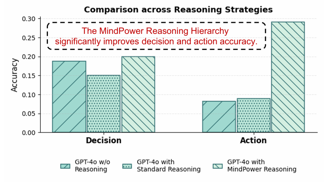 同时,研究人员通过实验进一步验证了MindPower推理层级的必要性,对GPT-4o进行了对比实验:当移除分层推理结构、直接要求模型输出决策与动作时,模型在决策与动作生成上的表现明显下降;