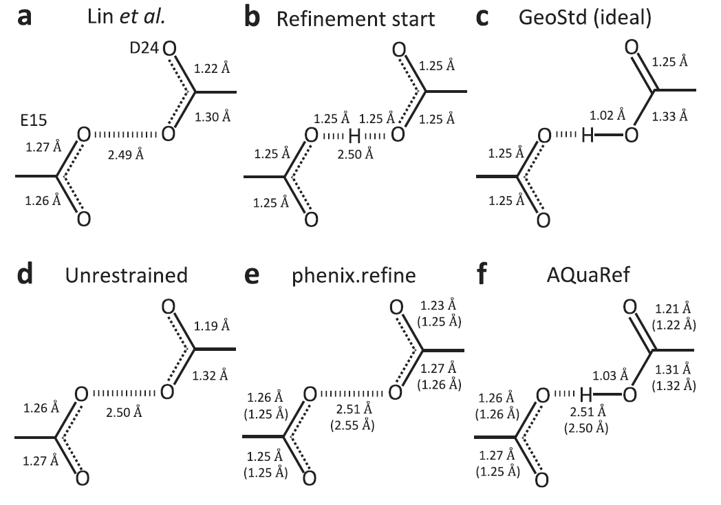 在短氢键体系的测试中,研究人员以帕金森病相关蛋白 DJ-1 及其同源蛋白 YajL 为例,检验 AQuaRef 对质子化状态的处理能力。传统精修方法受数据库立体化学约束影响,往往会使键长偏离真实值。以对称双质子化结构作为初始模型进行 AQuaRef 精修时,所得质子位置和键几何与无约束精修结果一致;而加入传统约束后,键长则被拉向数据库中的非质子化标准值。当实验数据被截断至 2 Å 分辨率、原子细节明显减少时,AQuaRef 仍能恢复与原始 1.15 Å 数据几乎一致的结构,而传统约束精修则进一步偏离真实构型。AQuaRef 将质子定位于 DJ-1 中 D24 残基的 Oδ2 原子,这一结果同时得到能量计算和差值电子密度图的支持。