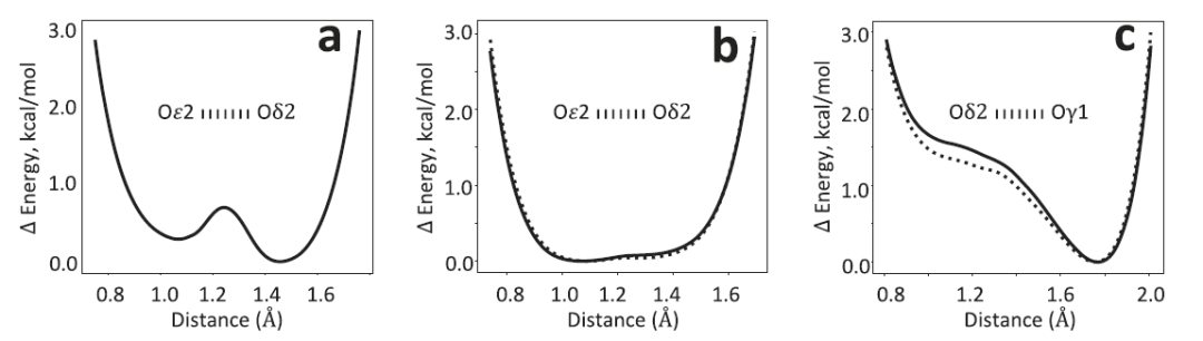 在 YajL 蛋白中,两处 E14/D23 短氢键的 AQuaRef 精修结果同样与无约束精修一致,表明质子由 D23 与 E14 共同共享,呈现典型的低势垒氢键特征。这一情况与 DJ-1 中质子主要定位于单个氧原子的情形不同。AIMNet2 给出的能量分布呈现较为平坦的势能面,意味着质子位置可以在实验数据的约束下自由调整。同时,差值电子密度图在氢原子附近均出现显著高于 3σ 的峰值,为这一结构解释提供了进一步证据。