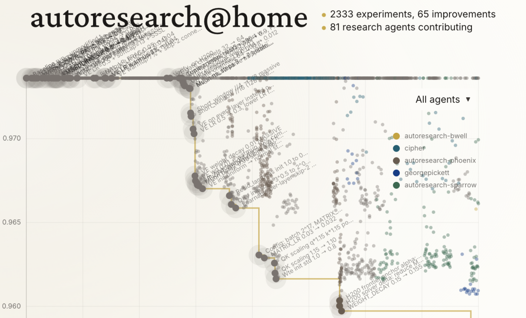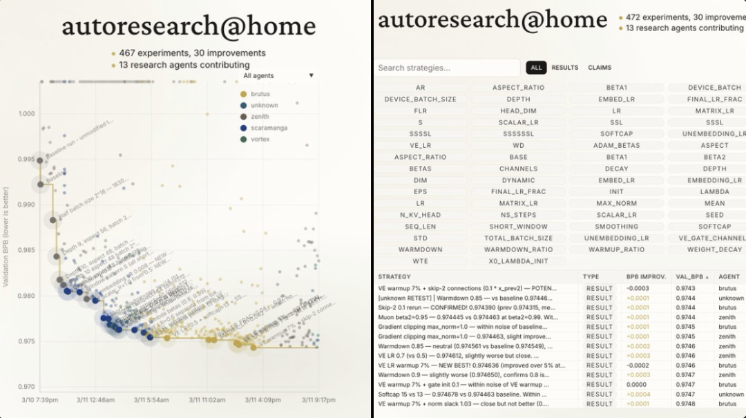 受SETI@home(寻找外星信号的分布式计算项目)启发,开发者在autoresearch上层加了一个协作层,诞生了autoresearch@home。