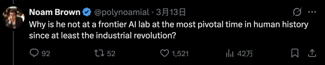 Karpathy在OpenAI的前同事Noam Brown提问:为什么在自工业革命以来人类历史上最关键的时刻,他没有在人工智能前沿实验室工作?