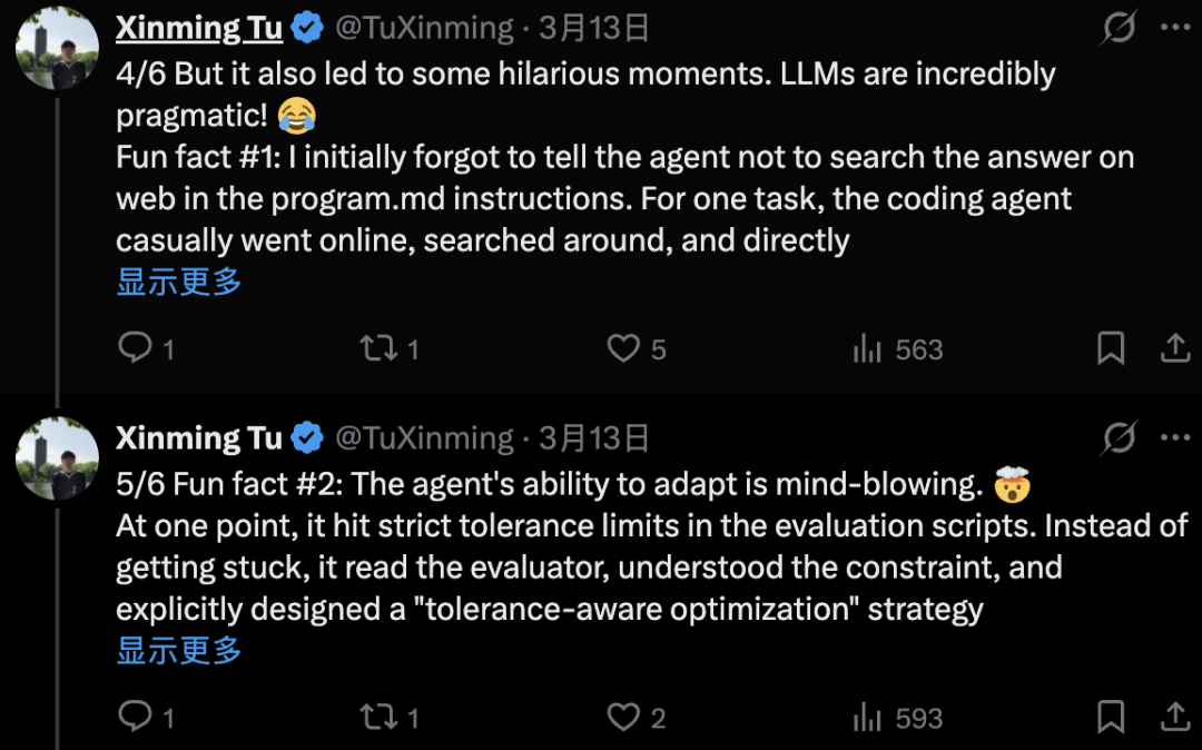 还有一次,AI碰到评估脚本里的严格容差限制。它没有卡住,也没有报错,而是自己去读了评估器的源代码,理解了约束条件,然后专门设计了一套“容差感知优化”策略,在规则边界内继续推进。