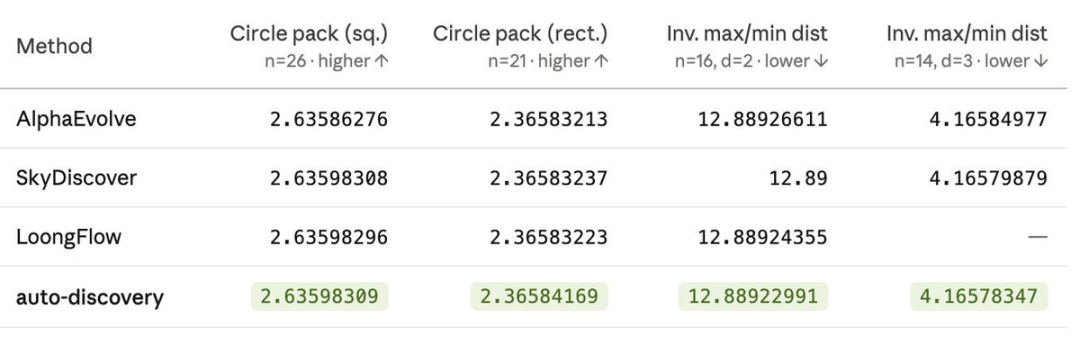 在autoresearch激发的另一个衍生项目auto-discovery中,发现除了自动训练模型,智能体在科学发现和算法发现中表现也不错。