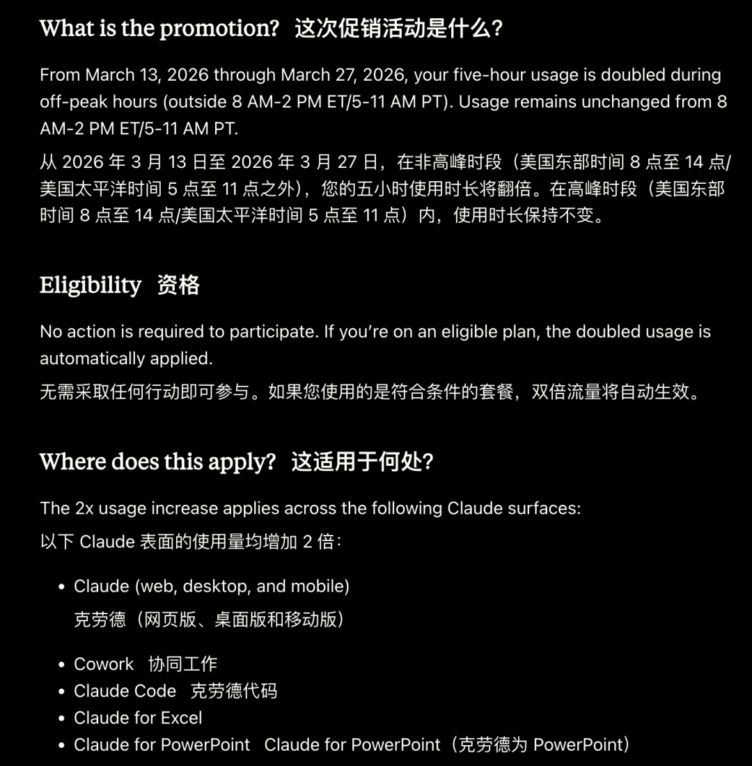 北京时间 3 月 14 号到 28 号这两周,Claude 搞了个限时「错峰双倍配额」活动。