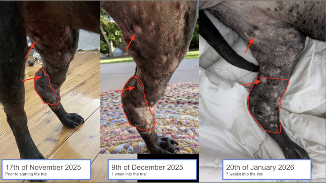 接受疫苗治疗后,毛孩子的病情在几周内就有了明显恢复,狗狗腿上的肿瘤缩小了50%。