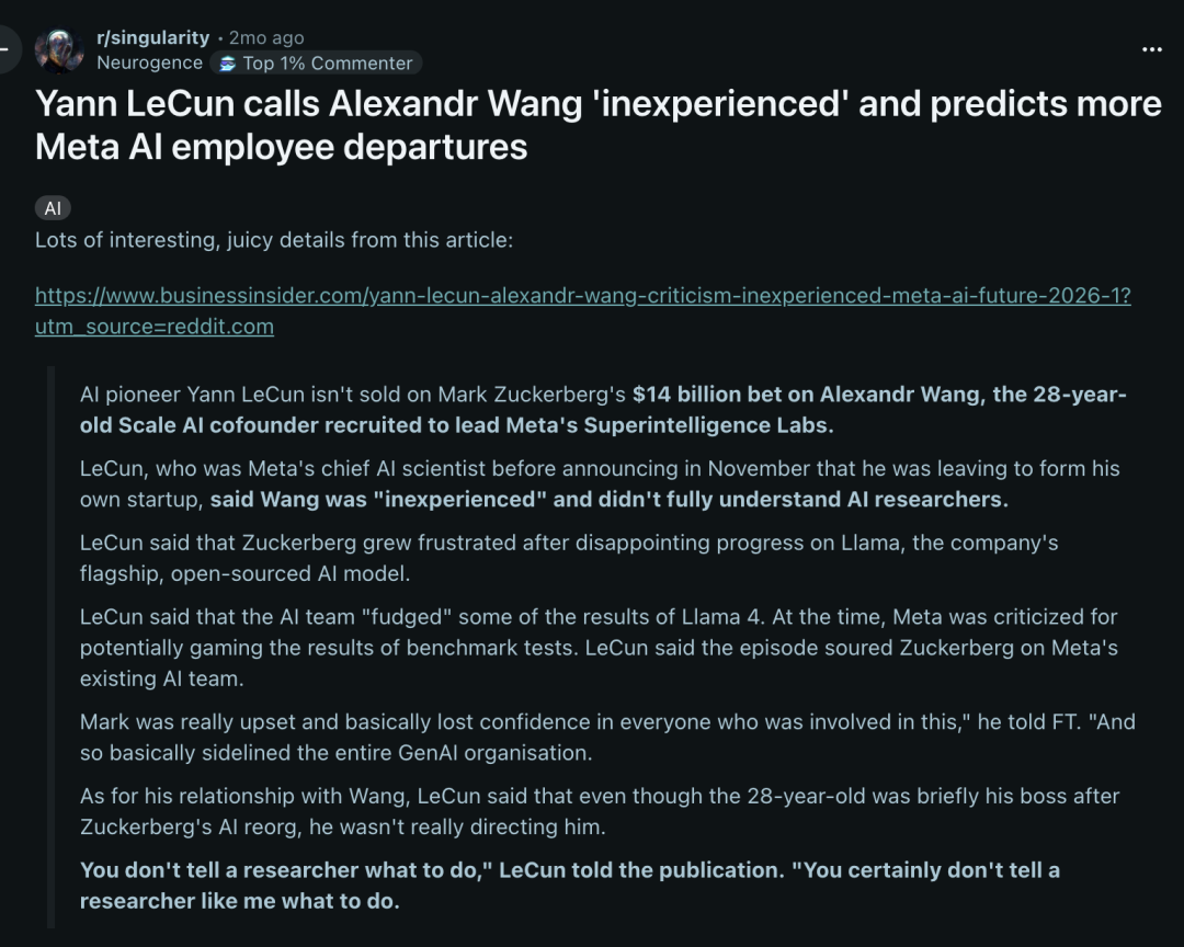 「Alex Wang缺乏研究经验,不了解AI研究者的工作方式,也不知道什么对研究者有吸引力、什么令他们反感。」