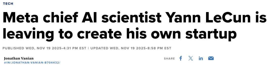 Yann LeCun,图灵奖得主,Meta首席AI科学家,在这个公司深耕了十多年的传奇人物。2025年11月,他拒绝向新来的Alex Wang汇报,宣布离开Meta自行创业。