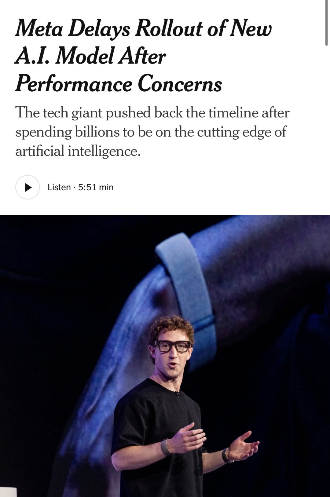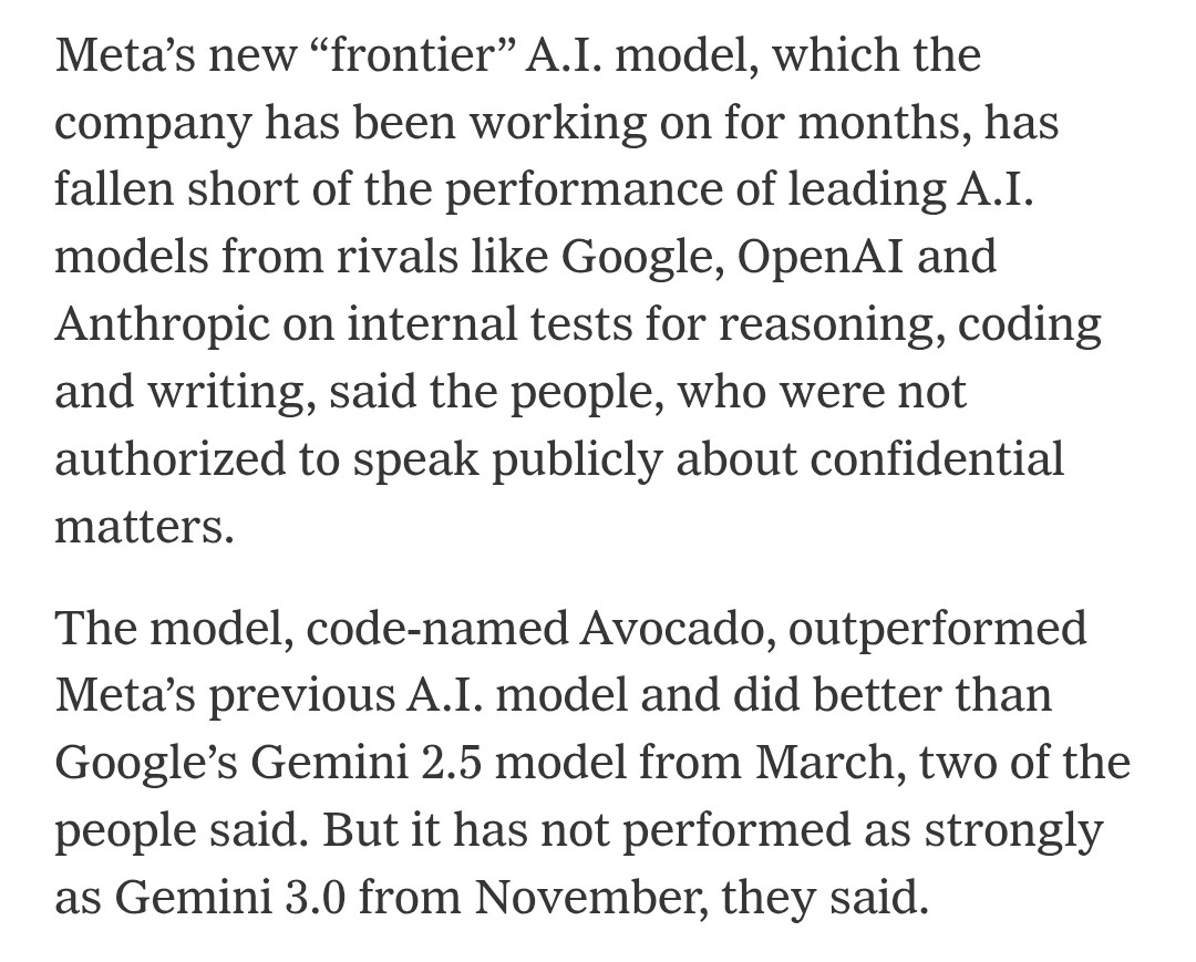 刚刚,《纽约时报》援引三位内部知情人士消息:Meta的AI模型「牛油果」(Avocado)延期了。