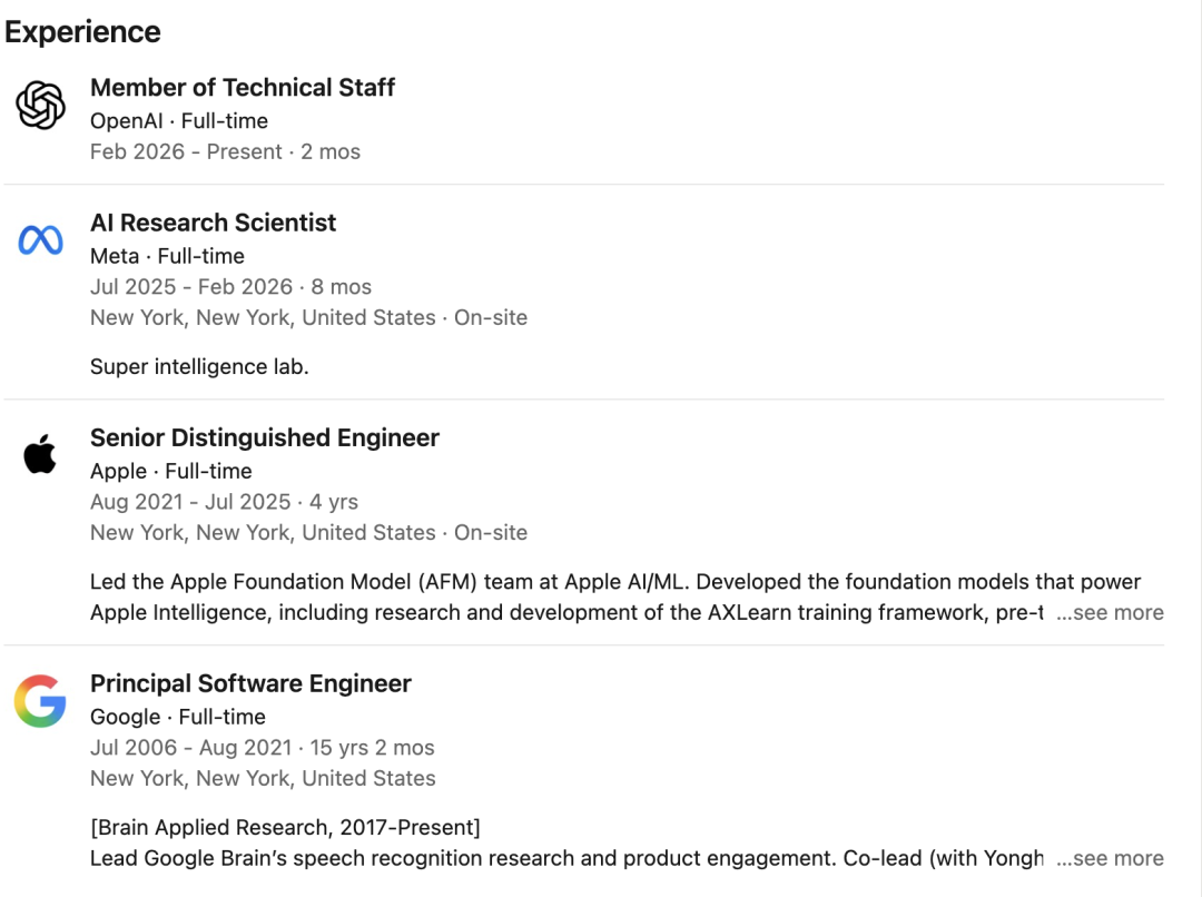 2026年2月,庞若鸣悄然离职,加入了OpenAI。