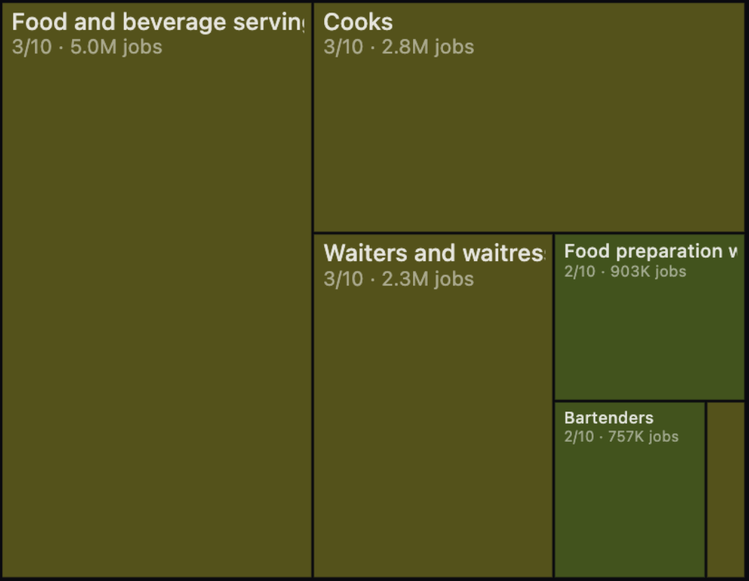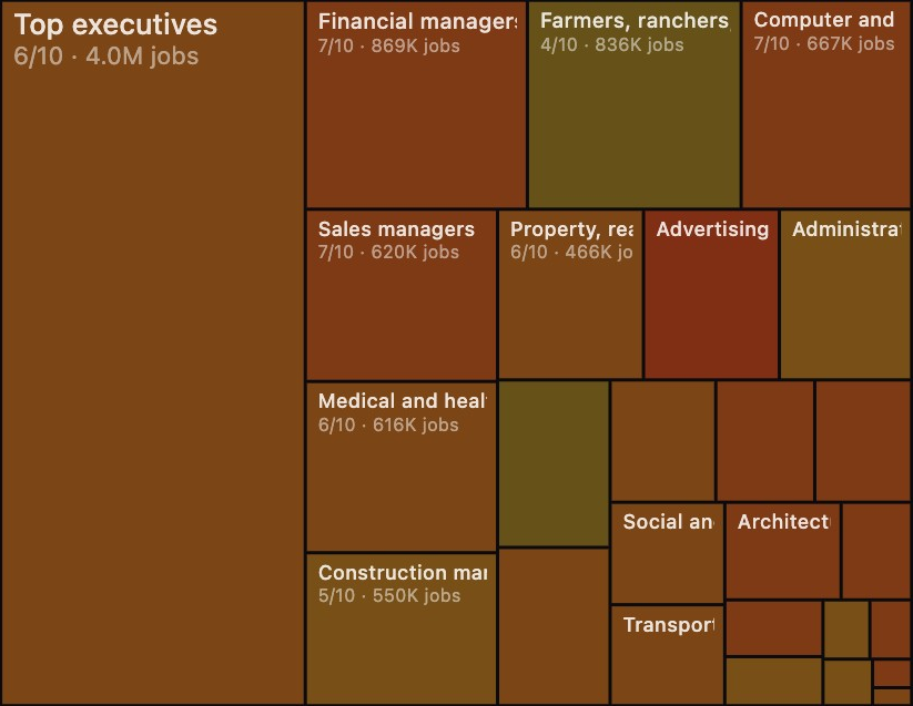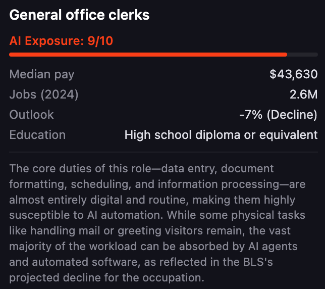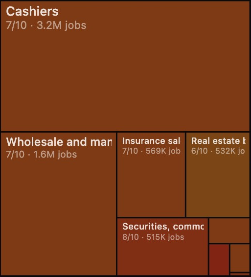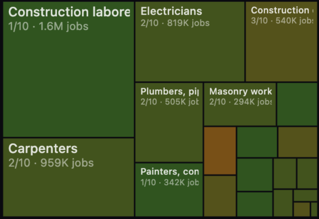 他从美国劳工统计局(BLS)提取了342种职业,并为每个岗位打出AI替代风险的评分(0-10)。