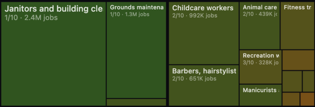 此外,理发师、动物护理、清洁工、医疗个人护理、运输物料搬运等受AI冲击比较小。