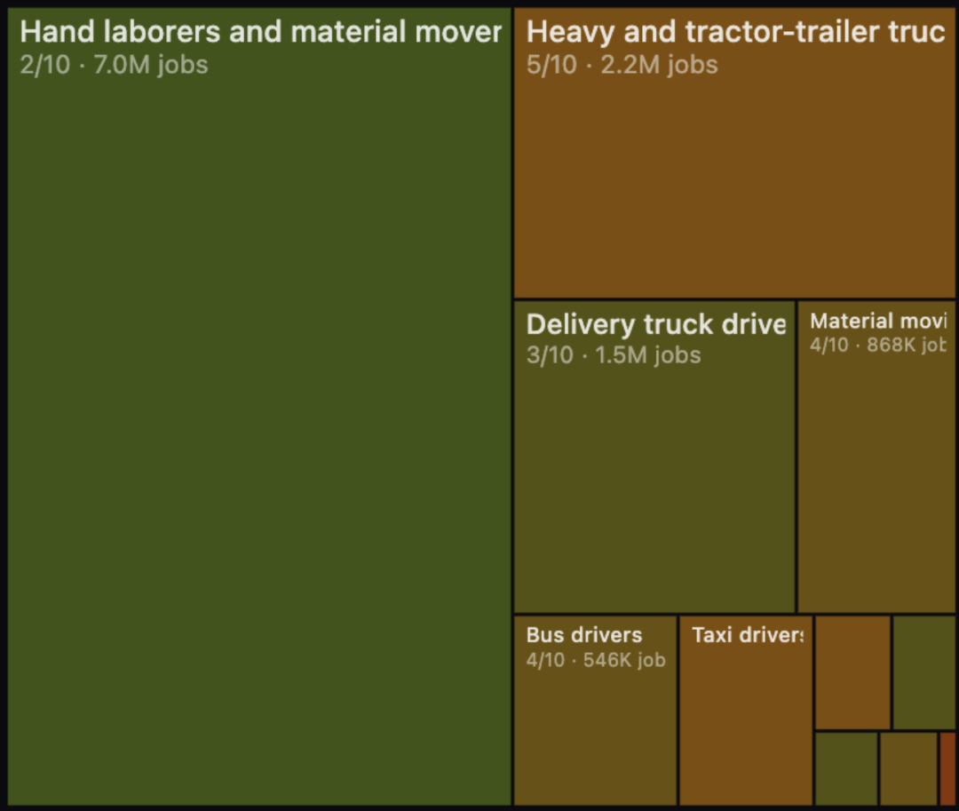 其中,受影响最大(6-10)的岗位占比42%,即5990万;受影响最小的(0-1)占比仅4%,只有620万个岗位。