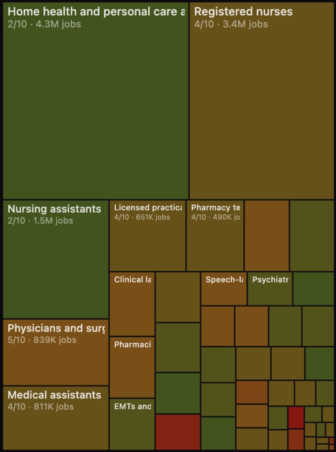 在交互图表中,可以清晰看出,大范围飘绿的区域,基本上都与复杂现场环境、上手实操的岗位有关。