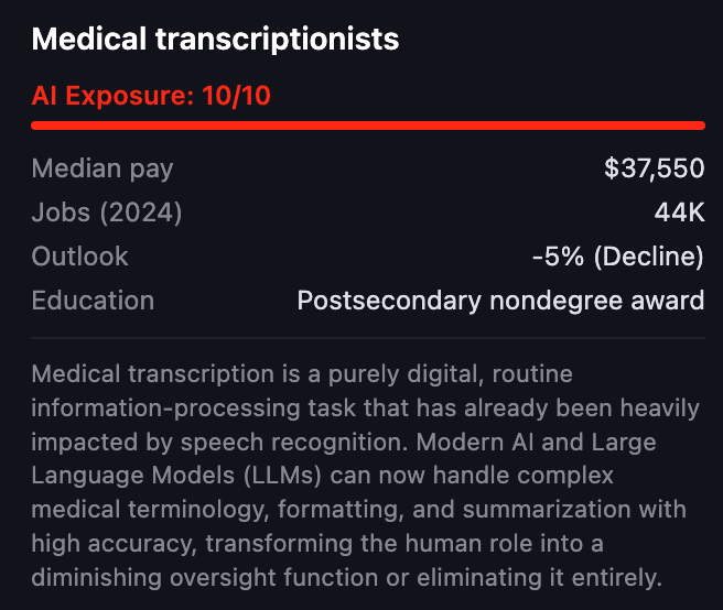 值得一提的是,医疗转录员是所有岗位中,风险最高的。