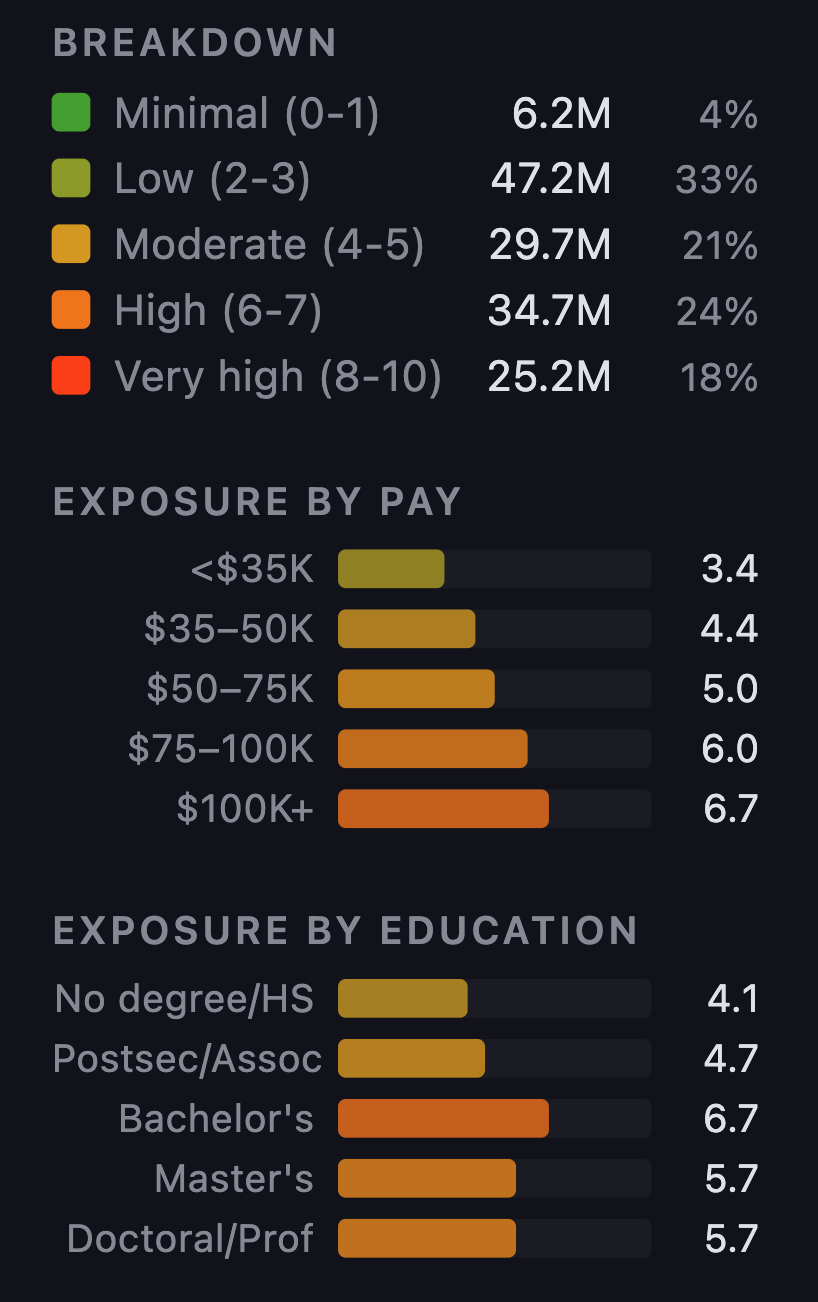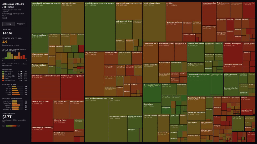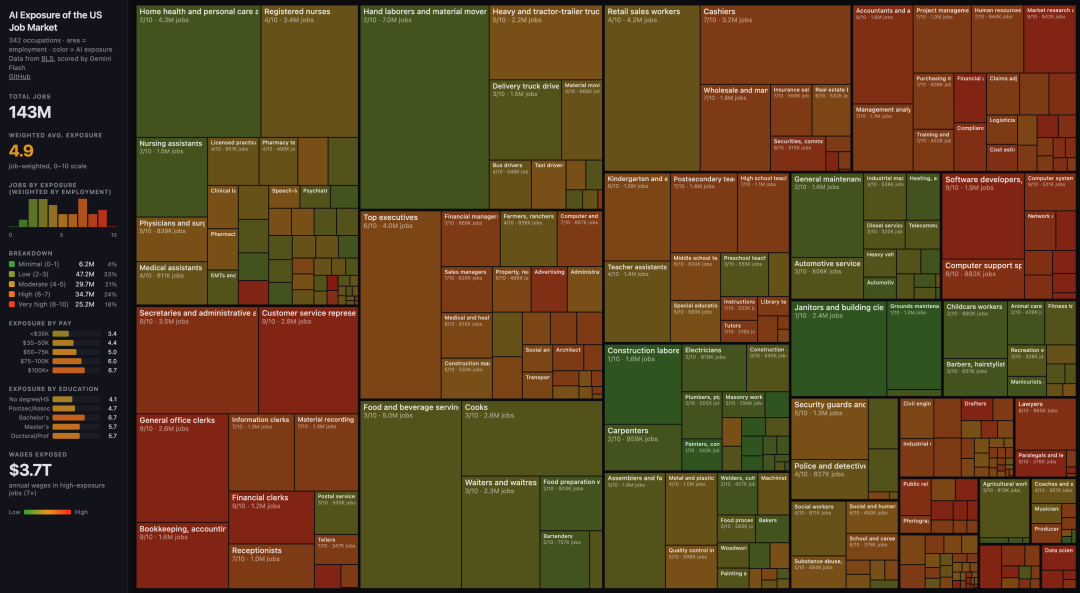 全美342种职业,1.43亿个岗位,由Gemini Flash打分,所有职业的平均暴露水平高达4.9分。