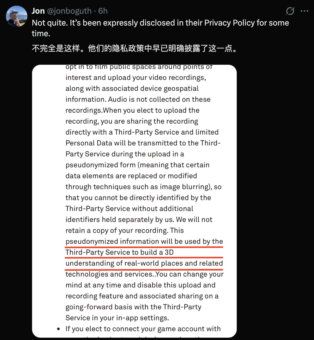 而且,从玩家们反应来看,游戏的隐私政策中也明确表示了上传的数据会用于3D技术。